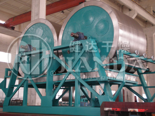 滾筒干燥機是一種內(nèi)加熱傳導(dǎo)型轉(zhuǎn)動連續(xù)干燥設(shè)備。旋轉(zhuǎn)的滾筒通過其下部料槽,粘附著一厚度的料膜,熱量通過管道輸送至滾筒內(nèi)壁,傳導(dǎo)到滾筒外壁,再傳導(dǎo)給料膜,使料膜中的濕得到蒸發(fā)、脫濕、使含濕分的物料得到干燥。干燥好的物料被裝置在滾筒表面的刮刀鏟離滾筒,到置于刮刀下方的螺旋輸送器,通過螺旋輸送器將干物料集中、包裝。